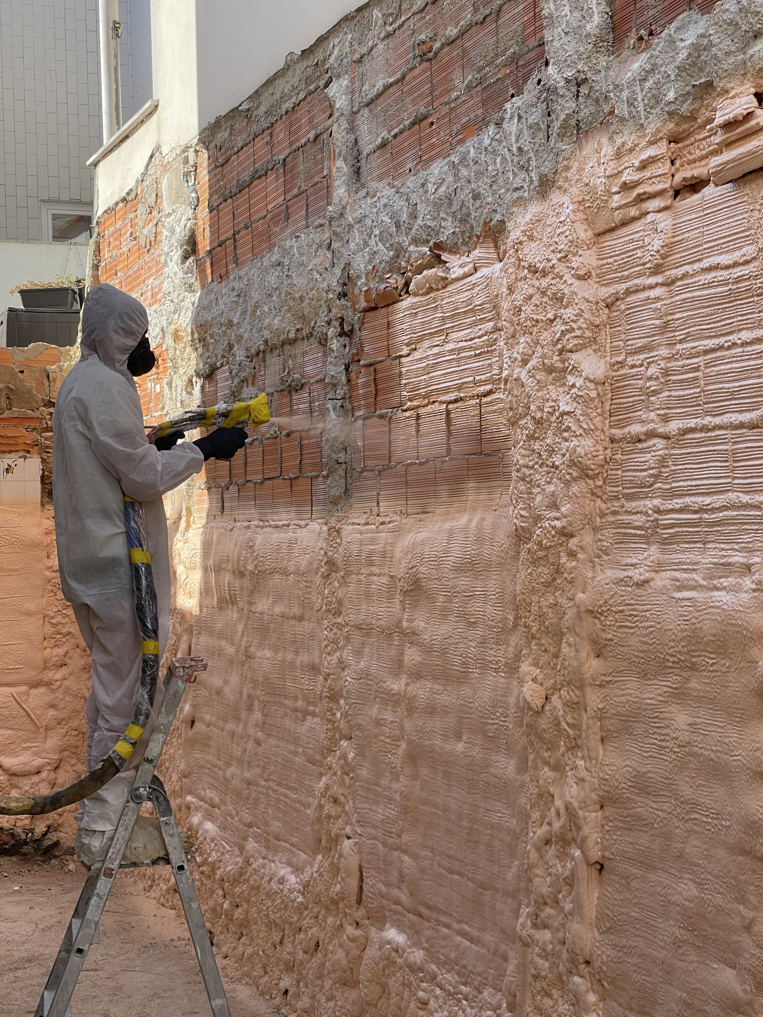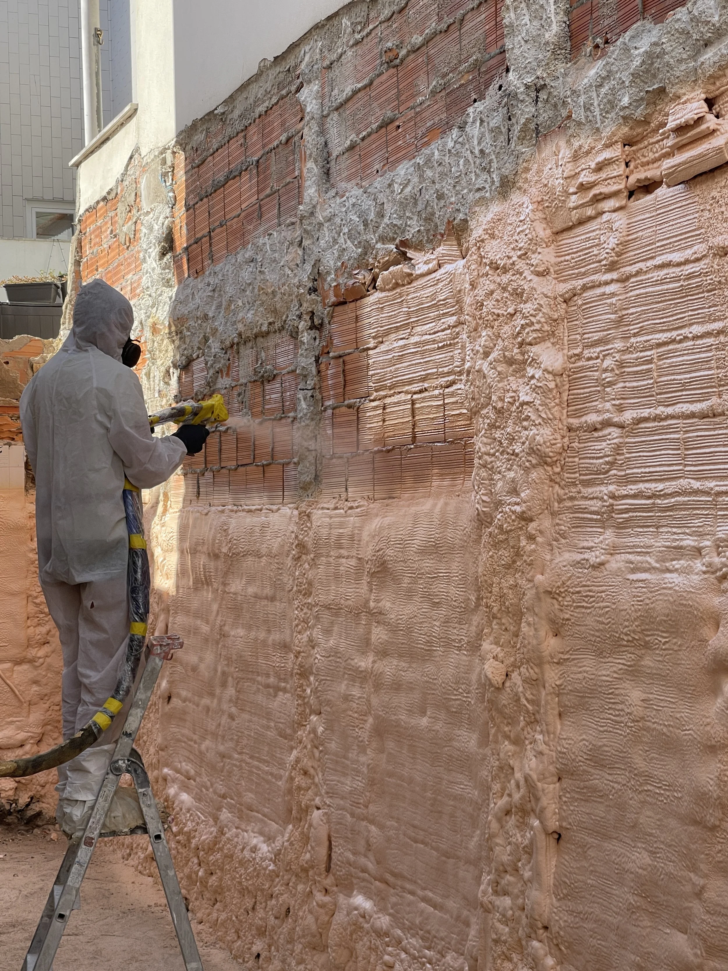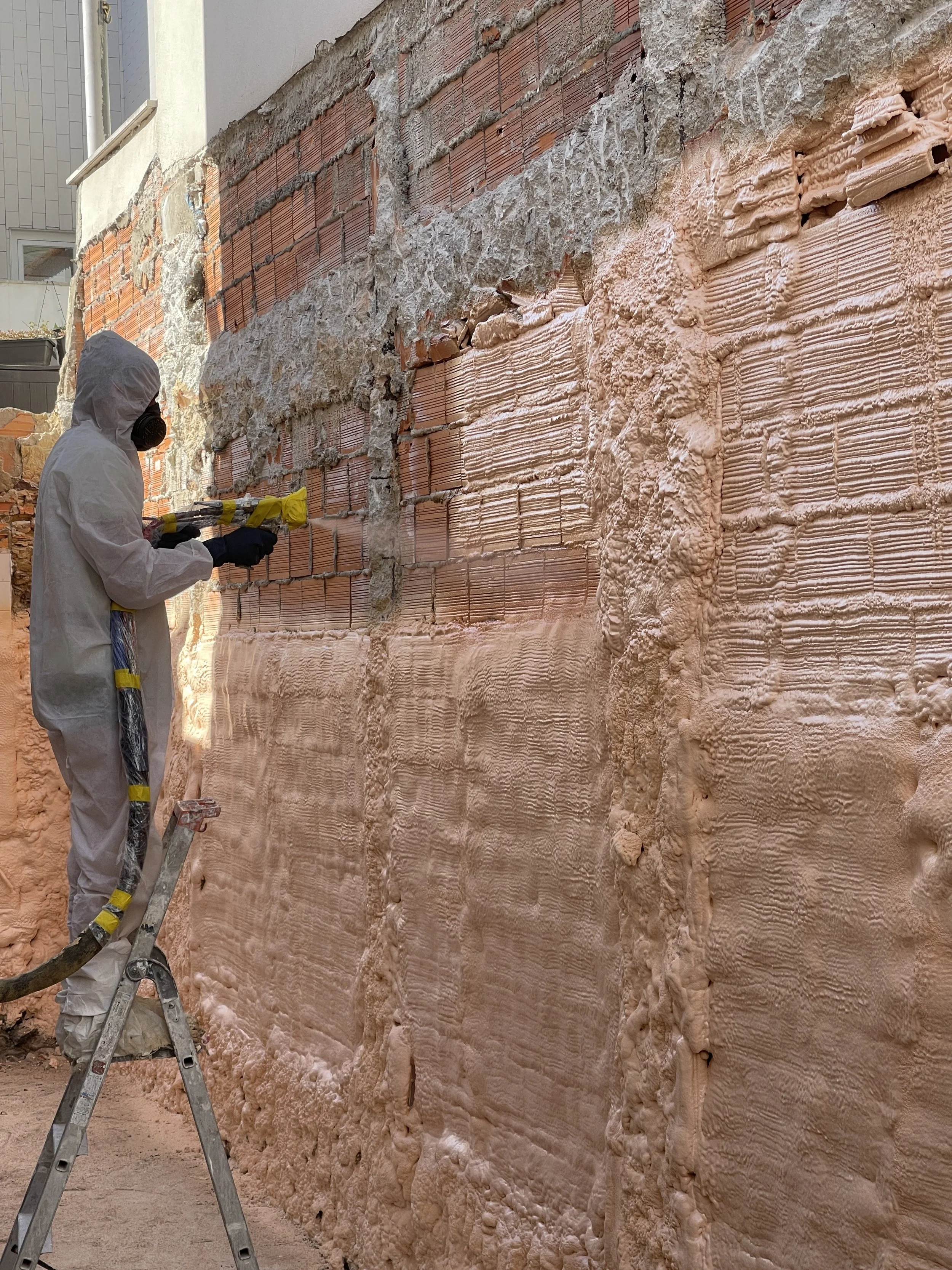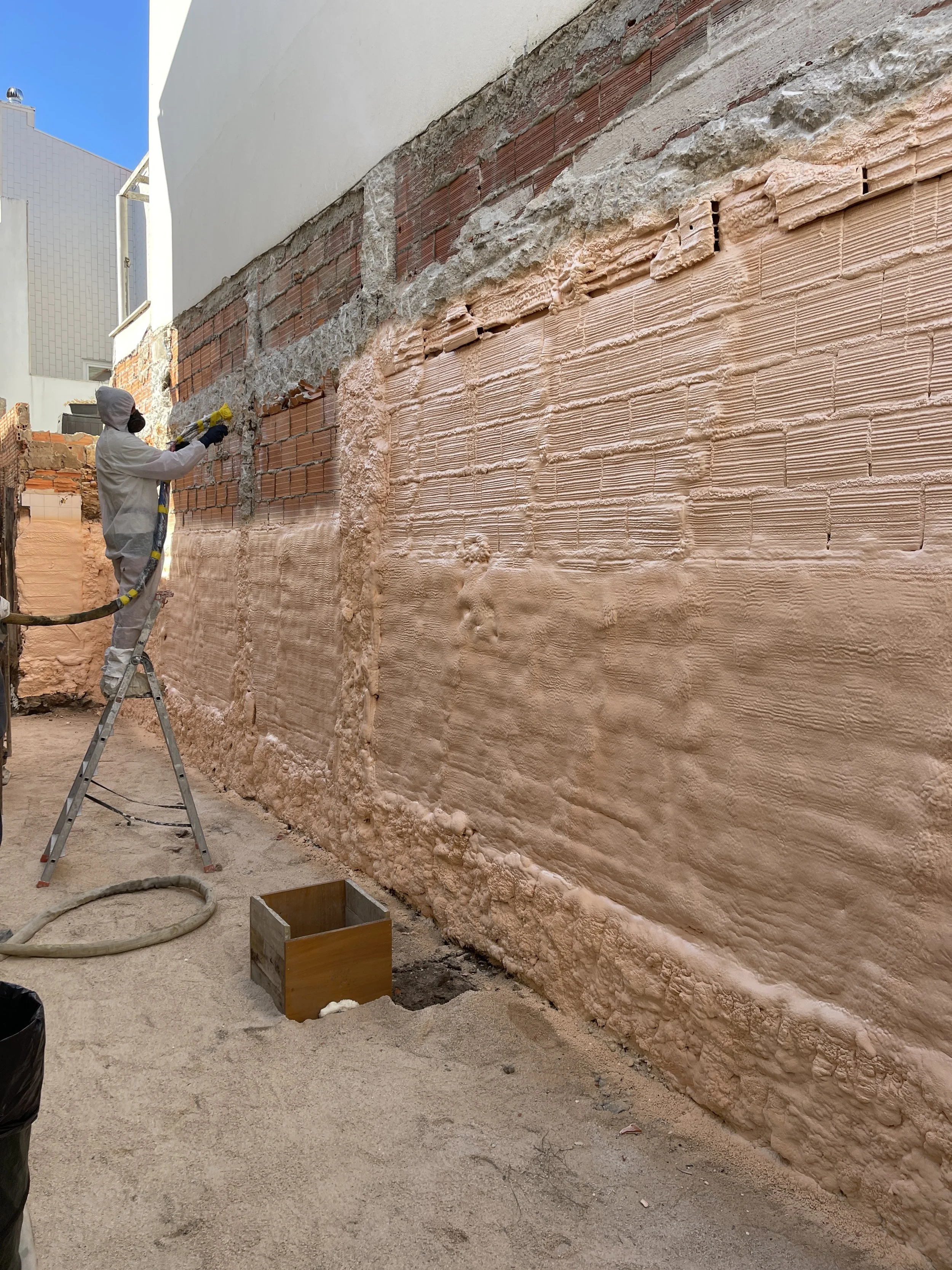 Projeção de poliuretano nas paredes de uma construção nova para conseguir um isolamento térmico e acústico duradouro. A projeção de poliuretano cria uma barreira contínua e sem emendas nas paredes, perfeita para um isolamento total, custos energéticos reduzidos e conforto geral da habitação.