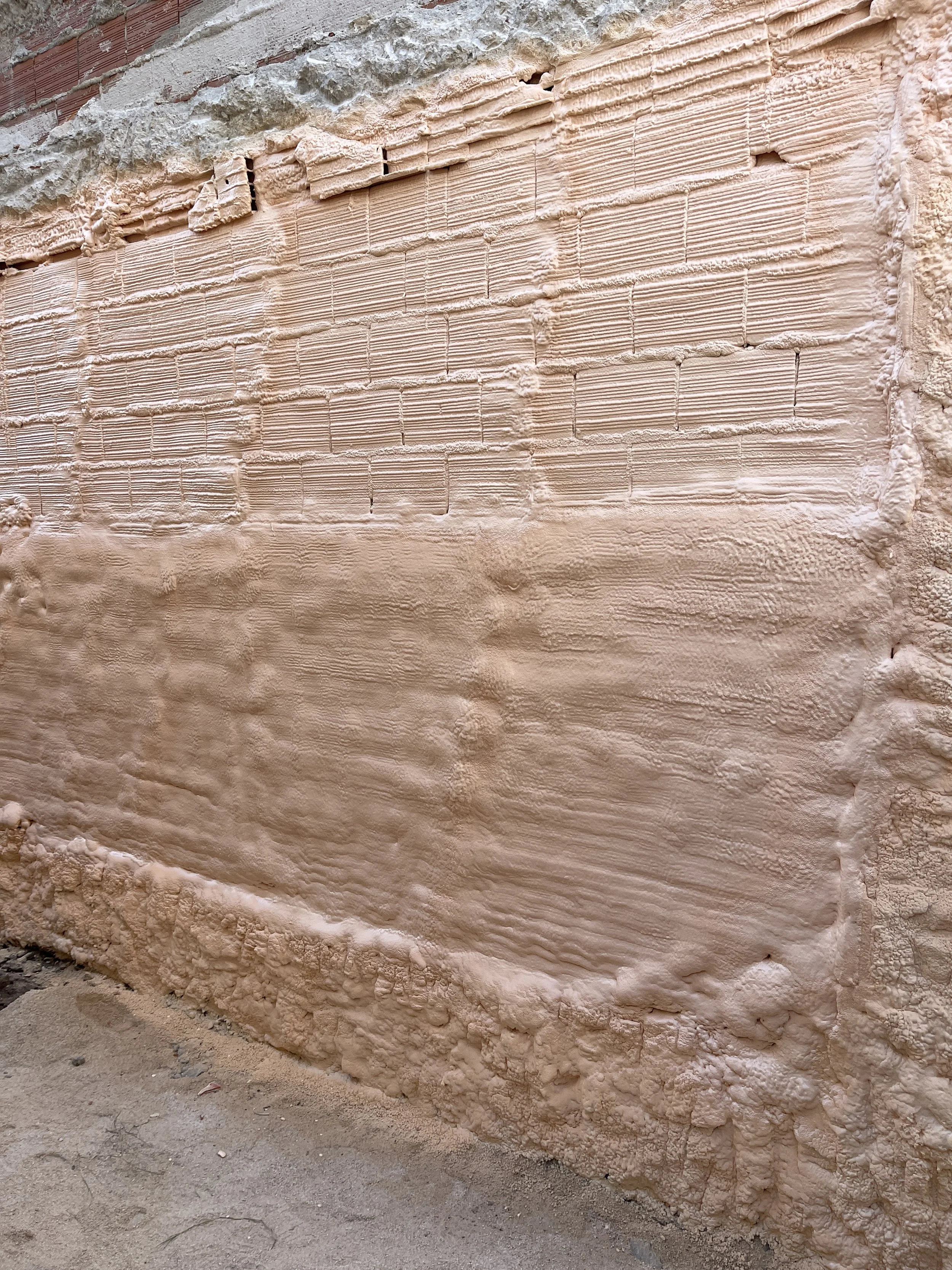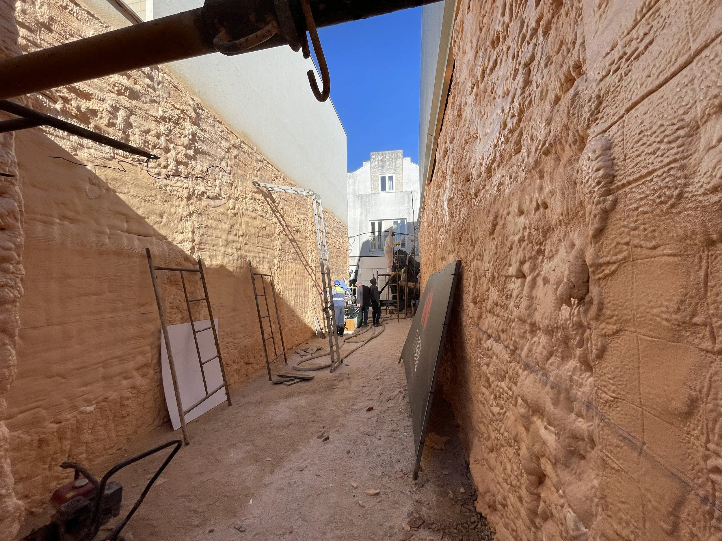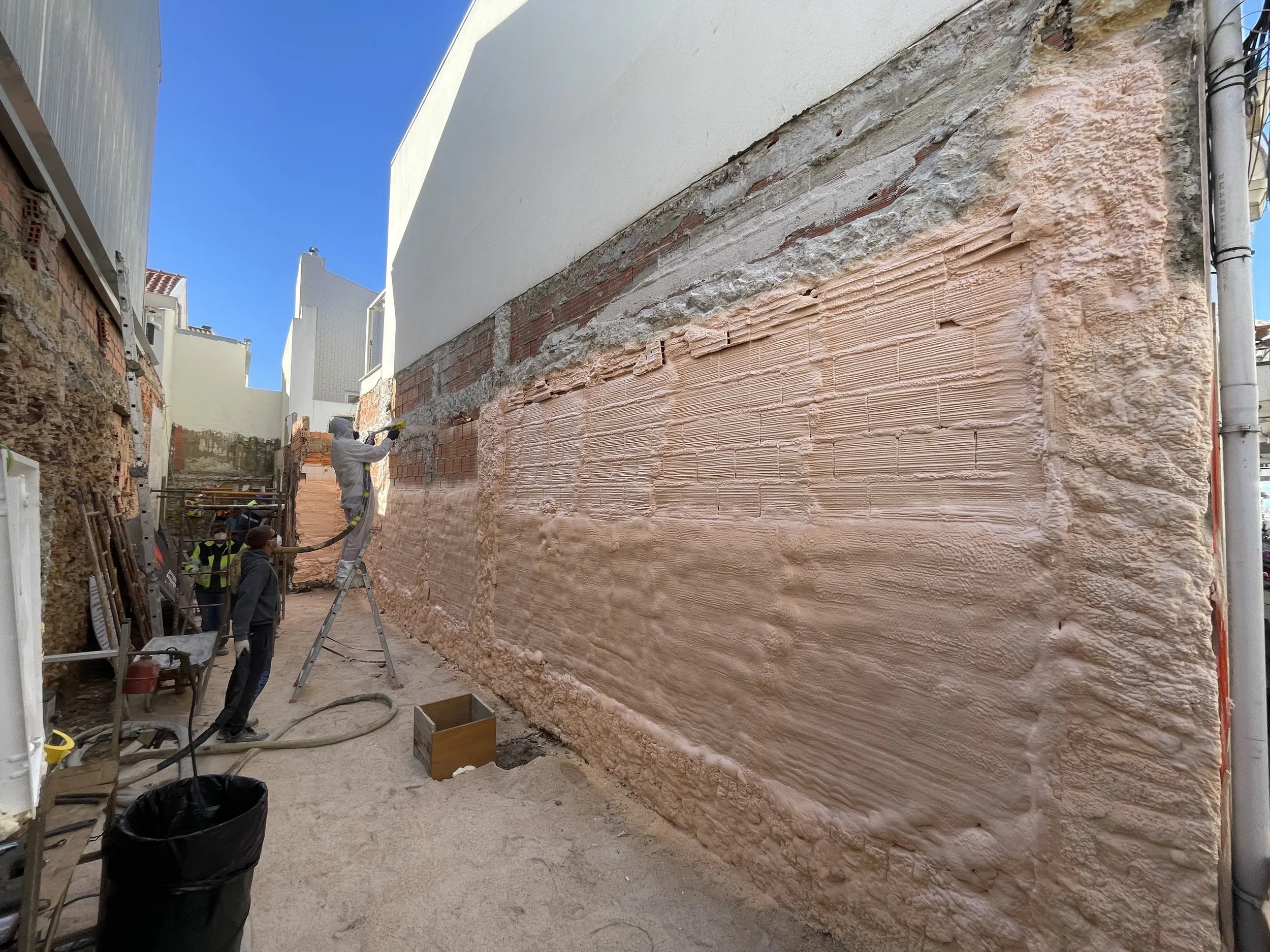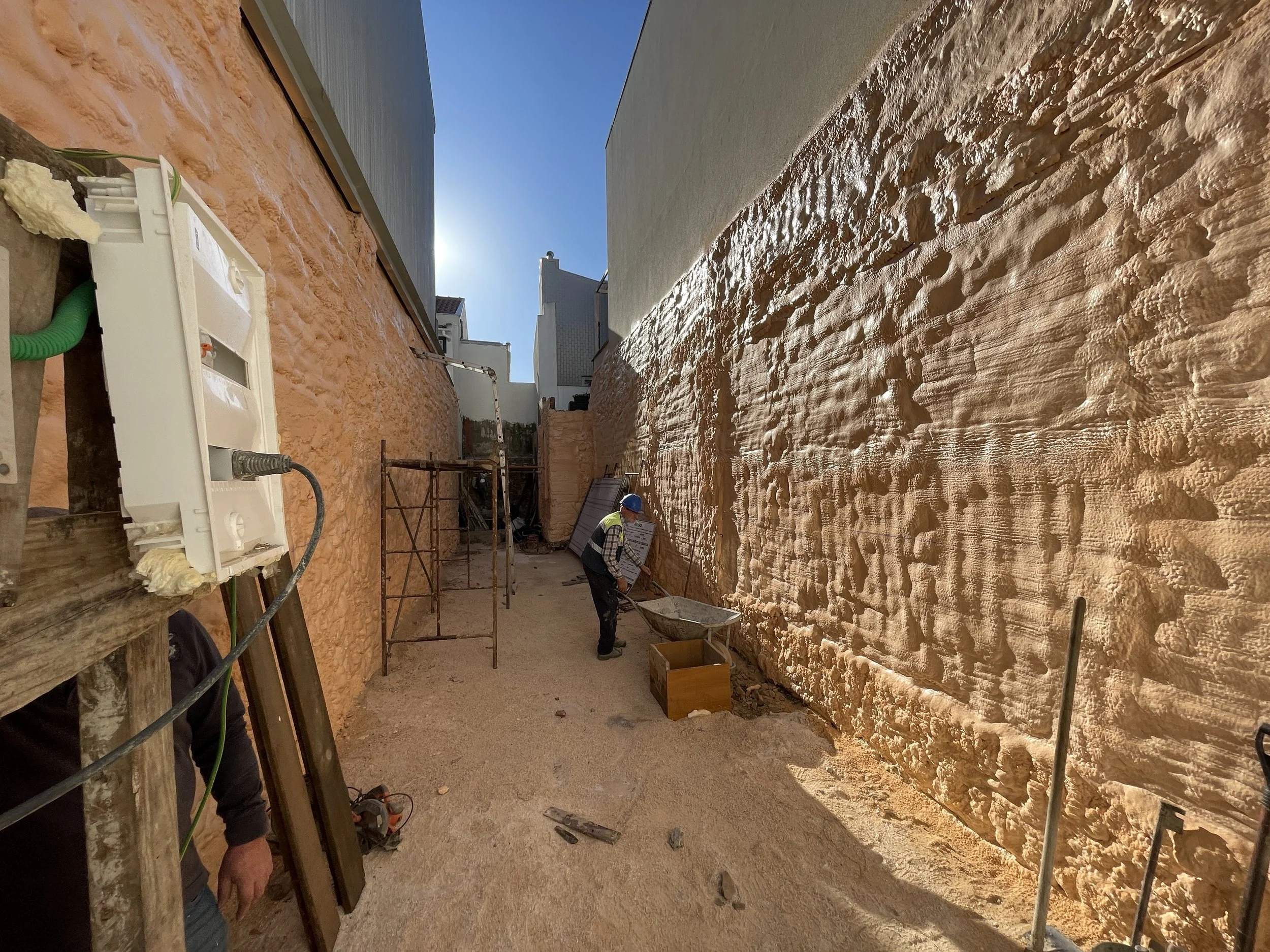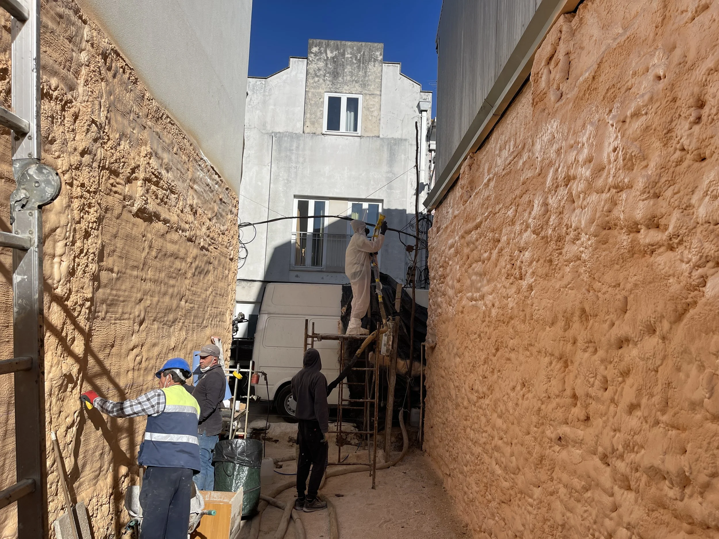 Projeção de poliuretano nas paredes de uma construção nova para conseguir um isolamento térmico e acústico duradouro. A projeção de poliuretano cria uma barreira contínua e sem emendas nas paredes, perfeita para um isolamento total, custos energéticos reduzidos e conforto geral da habitação.
